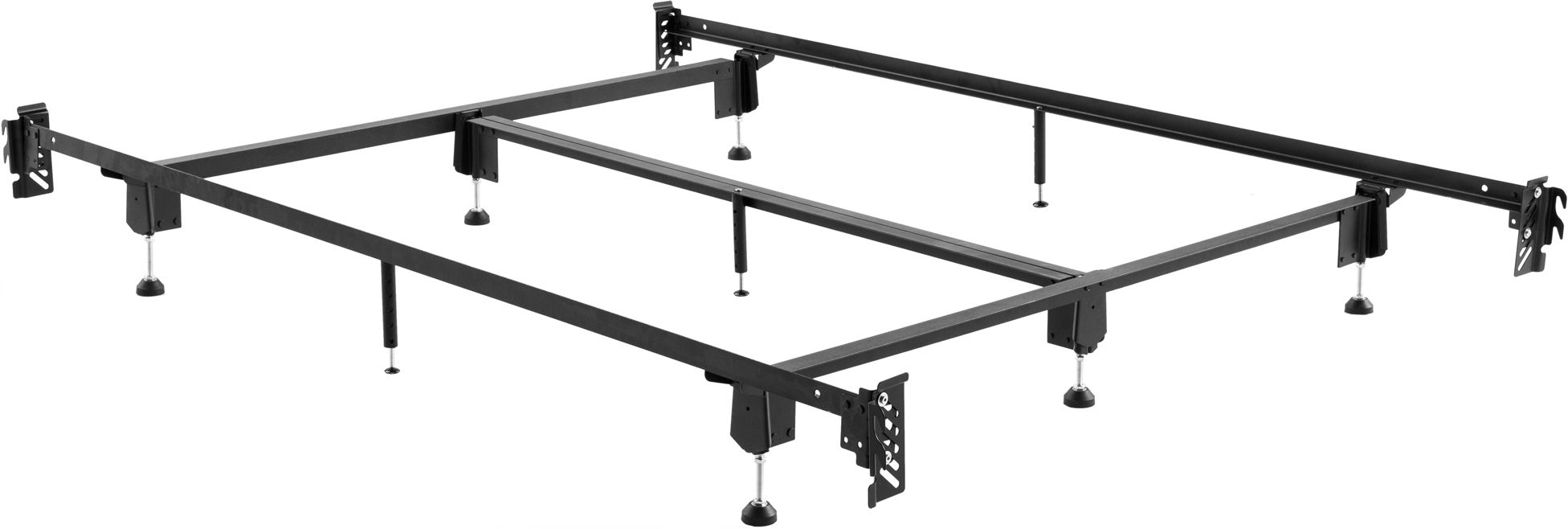 Steelock® super-duty bed frames are guaranteed to last and come with a lifetime warranty. Every aspect of the Steelock® bed frame is reinforced with the best engineering and heavy-duty steel necessary to securely support any mattress and accommodate any headboard. This frame features a 2.5-inch double rail center brace and full-length siderails. Four modification plates allow for a secure connection to hook-on headboards and footboard. The plates can be micro adjusted to accommodate virtually any headboard/footboard, and adjustable-height glide feet provide custom support for any bed.